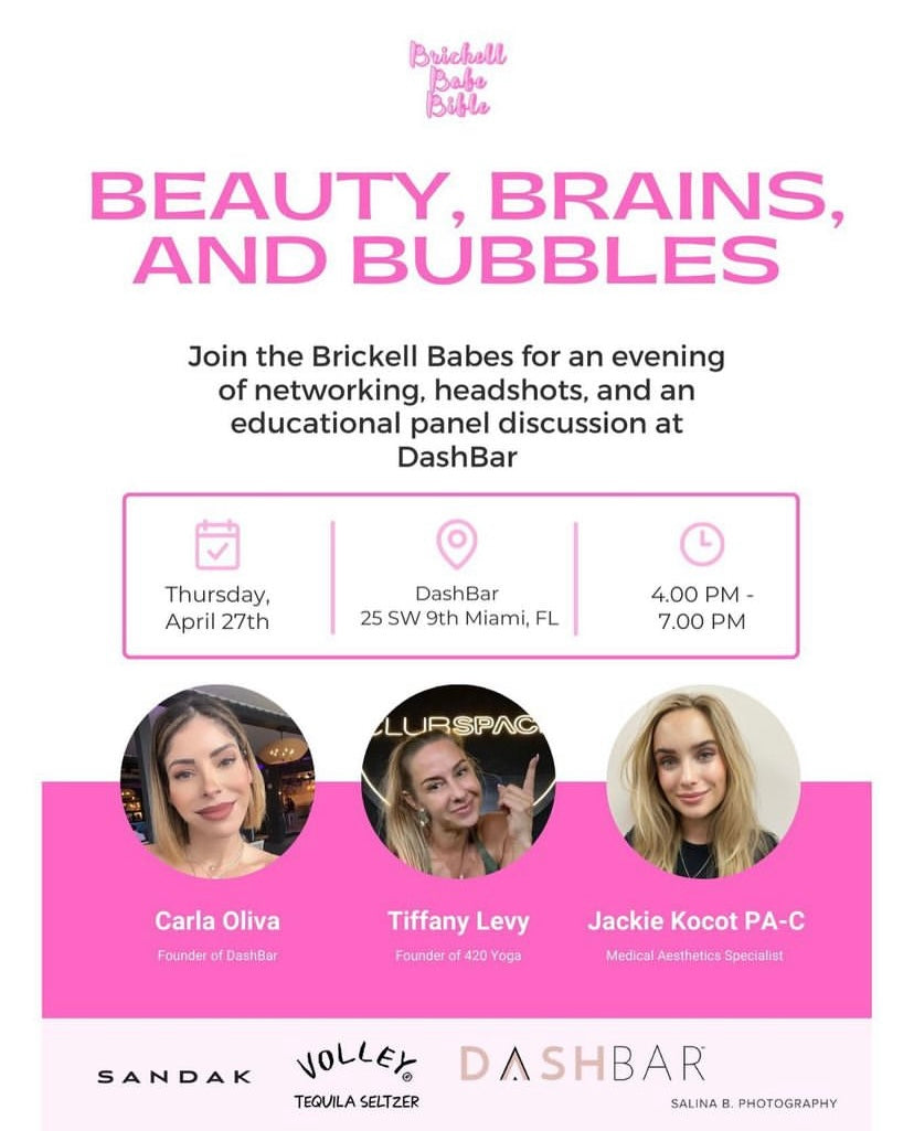We're thrilled to be partnering with The Brickell Babe Bible team for a Beauty, Brains, and Bubbles event! Join us Thursday, April 27th from 4-7pm for an evening of professional networking, beauty tips and an optional headshot opportunity with drinks provided by Volley Tequila Seltzer